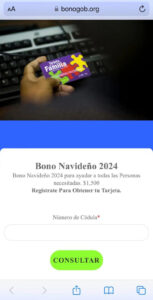 Al abrir el enlace aparece una imagen que se corresponde al Programa de Asistencia nutricional (PAN), de los Estados Unidos. Al hacer clic sobre el enlace de la página se lee además “Bono Navideño 2024 para ayudar a todas las personas necesitadas $1,500, regístrate para obtener tu tarjeta”, al tiempo que se le pide a las personas introducir su número de cédula.